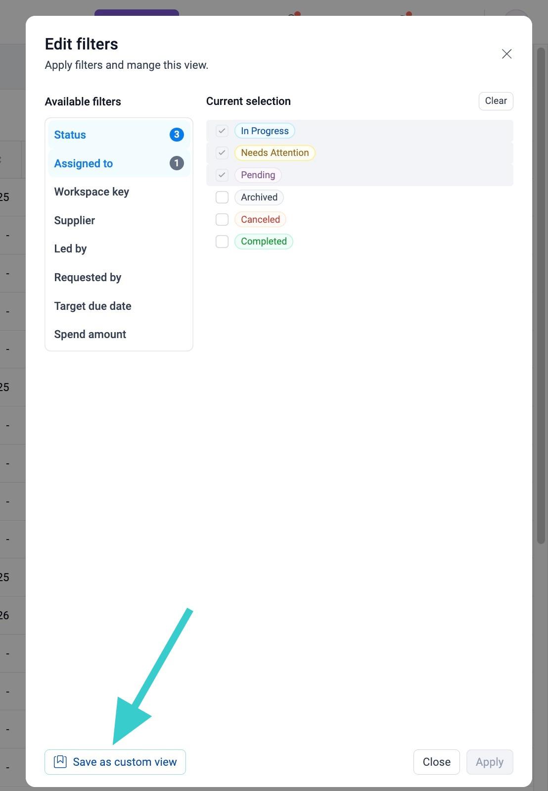 Available filters are pictured below. When setting Filters, they can also be saved as a custom view. By clicking “Save as a custom view” users will be prompted to create a name for a Saved View based on the filters chosen.
