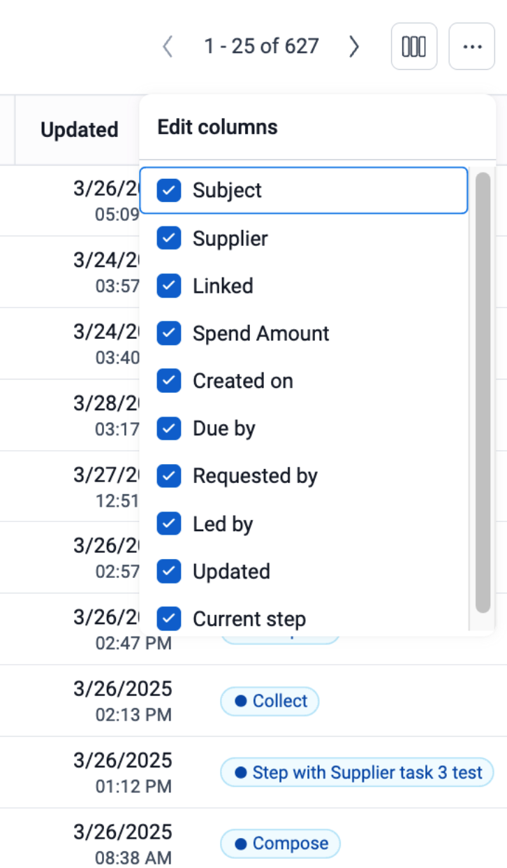 Additionally, the Hub has customization in the way it is viewed when it comes to Columns depicted. To change the columns shown in Hub, click the column pictured below. To hide and show columns, click the check boxes on or off.