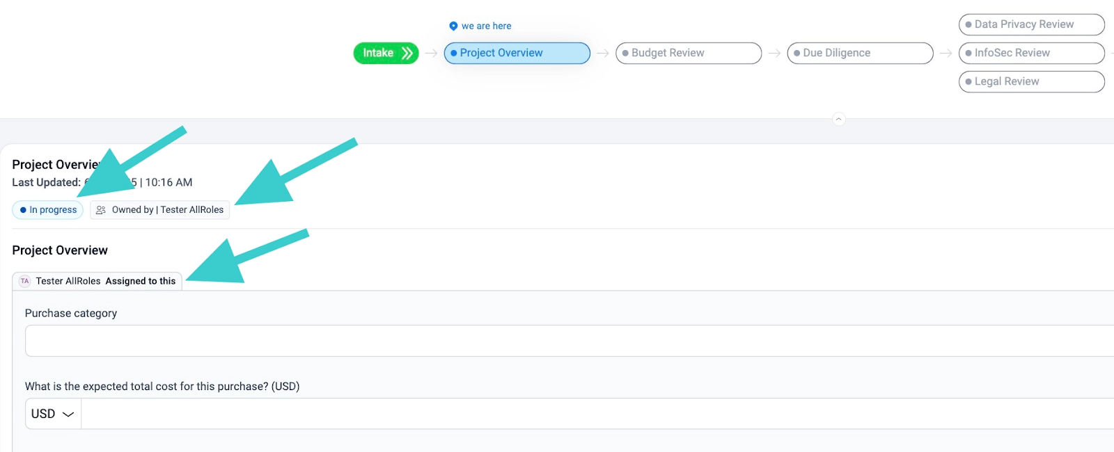 Project Step Tabs: Below the path users will see a tabbed experience that lays out each step within the project. When on a tab, users will have insight into what is needed for that step - this can be information, approvals, or both. Depending on their role, there will be labels to provide added guidance where action is needed.