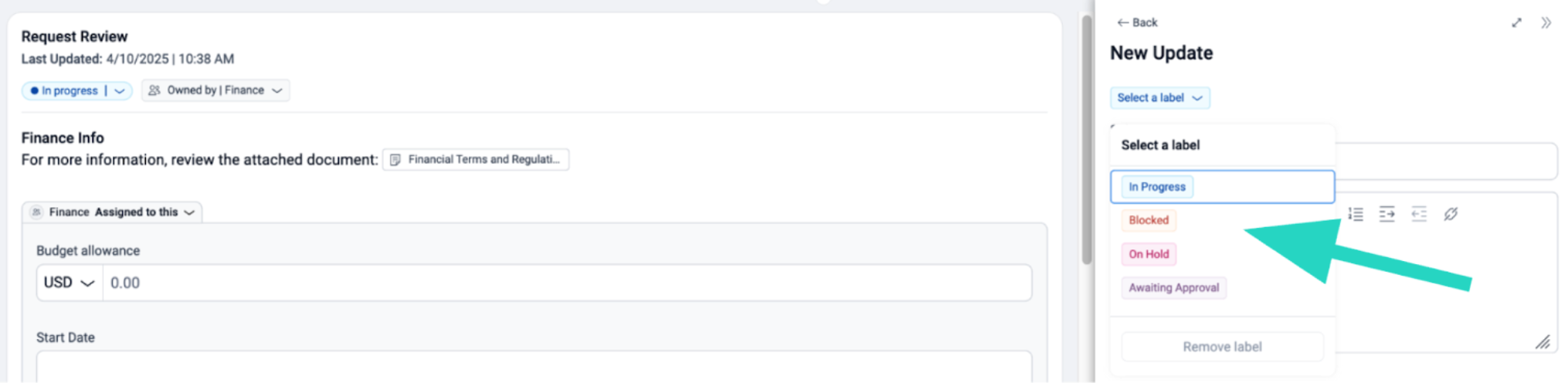 The updates tab is a way to track the status of a project. The labels seen below are customizable for each Project Type.