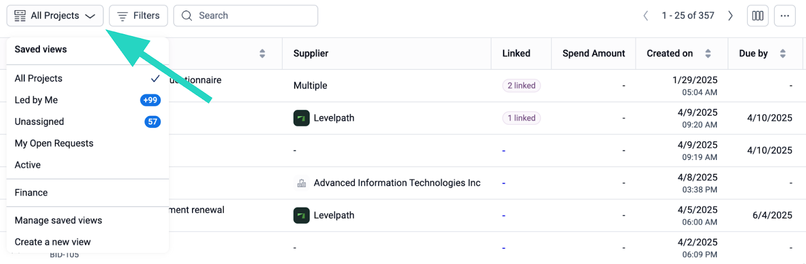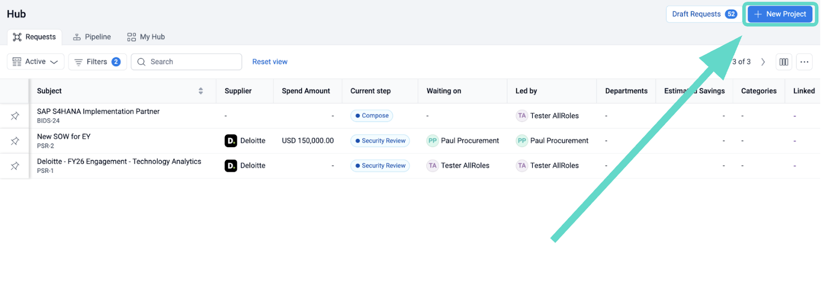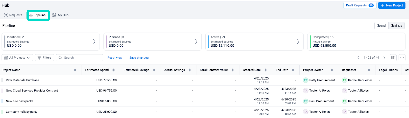 Within the Hub, users can also view their projects via the “Pipeline” tab. This tab presents projects based on status: Identified, Planned, Active, and Completed. Users can view aggregate spend or savings. They can also use filters and saved views to view relevant information.