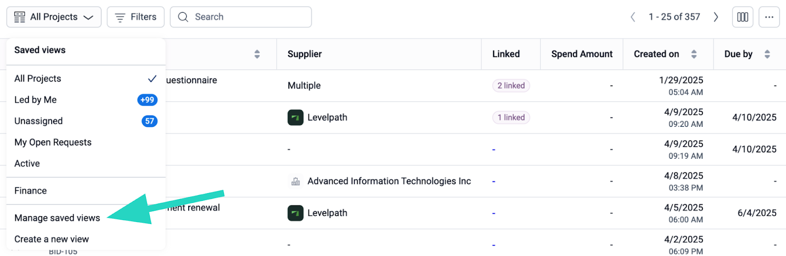 Once opened, users will be able to manage their saved views by clicking the “Managed Saved Views” button pictured below.