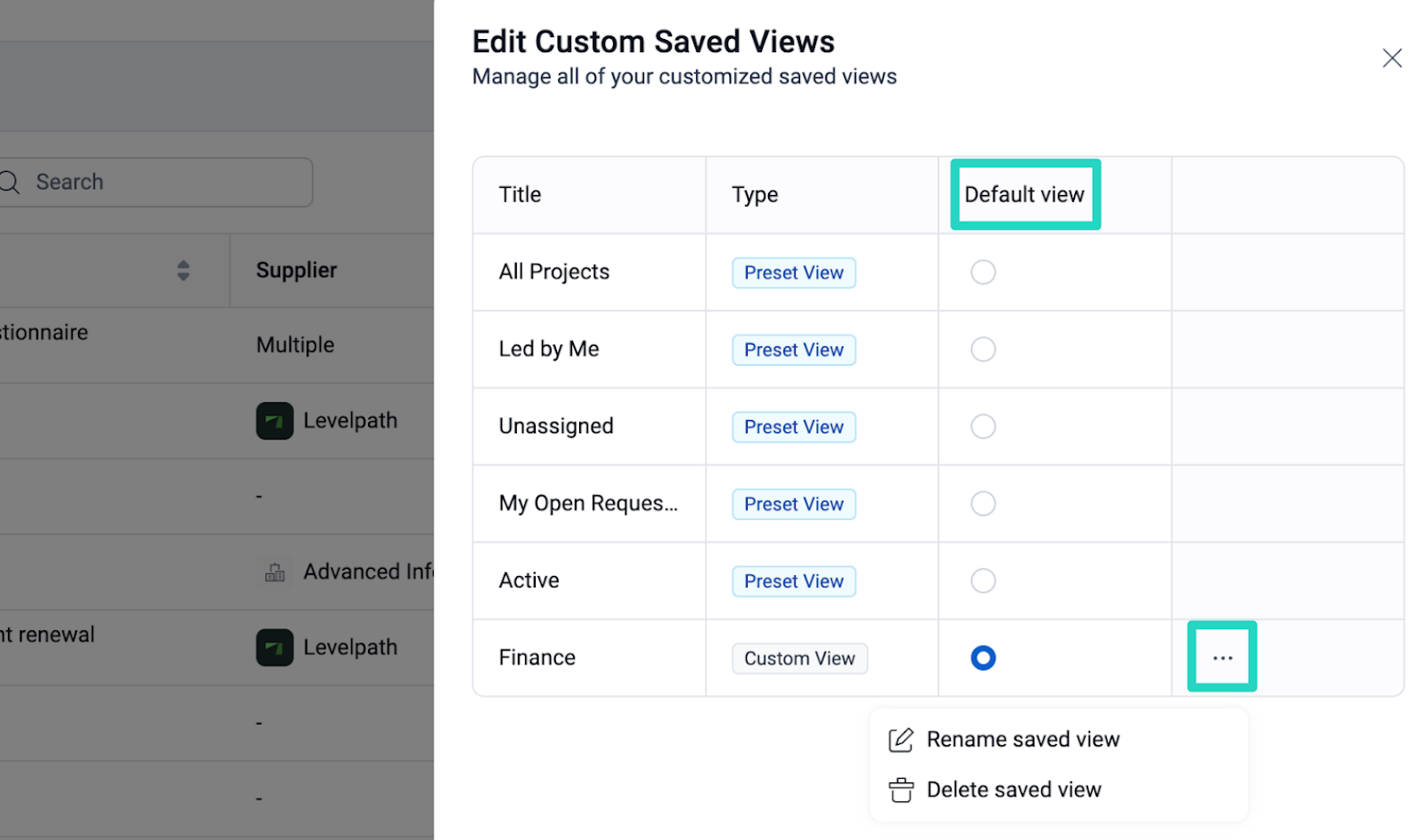 To set a view as a default view when entering the Hub, select the dot of the view desired for default. To rename or delete a custom view, click the three dots next to the view.