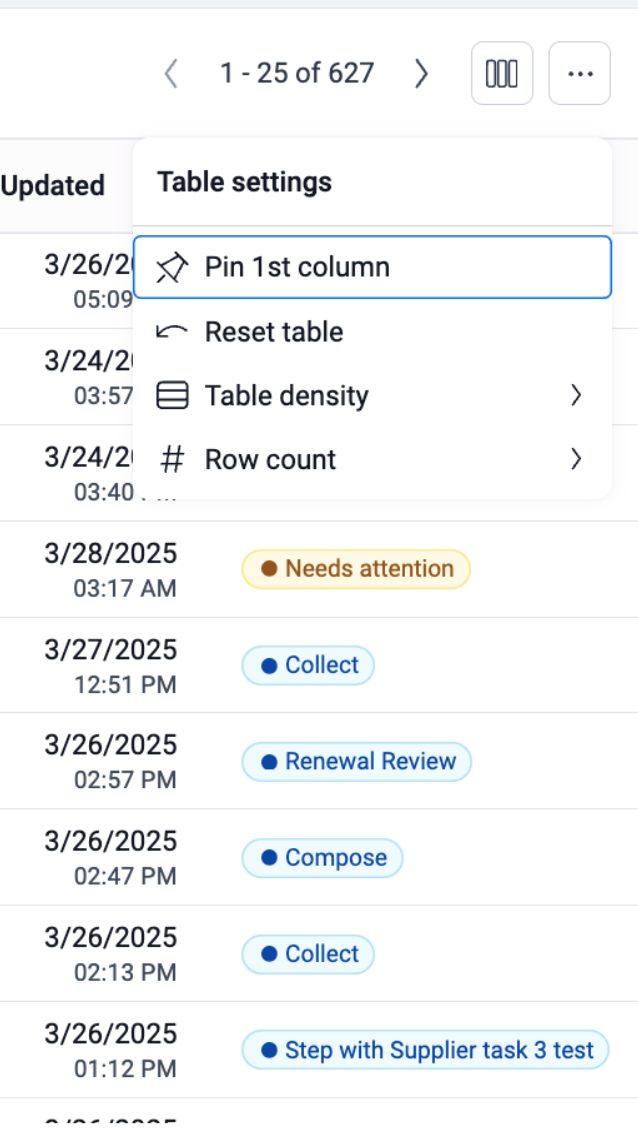 There are many table settings available in Hub. Use the 3 dots in the top right hand corner to Pin 1st column, Reset table, change the table density, and edit the Row count.
