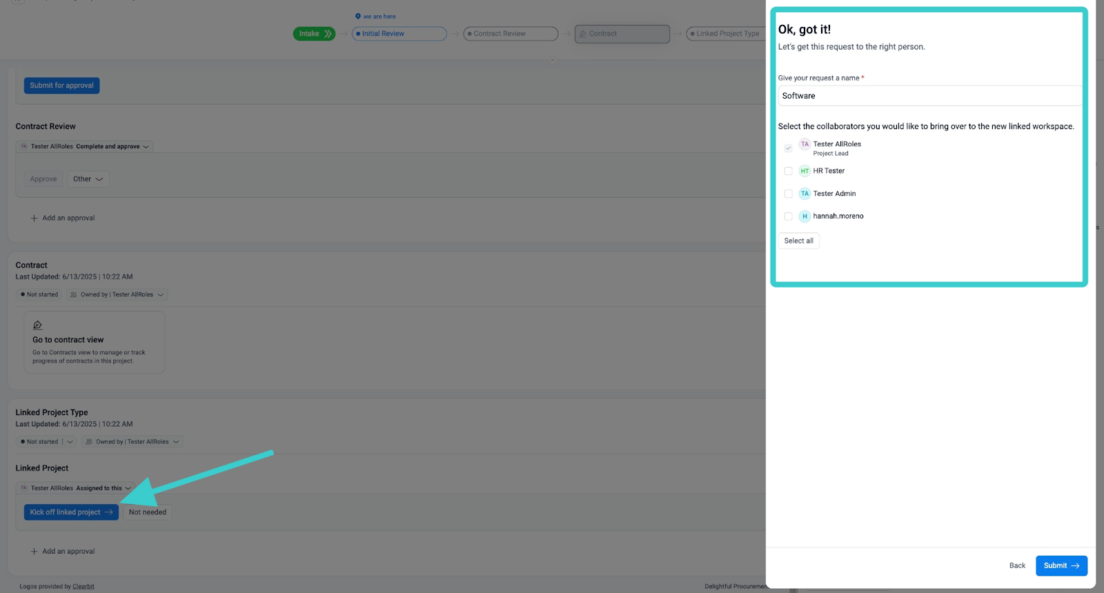 Linked Projects: When “kicking off” a linked project, step owners will be presented the intake form of the project that is being kicked off. At the bottom of the intake form, the initiator will have the opportunity to select all collaborators they wish to be carried over to the associated project: