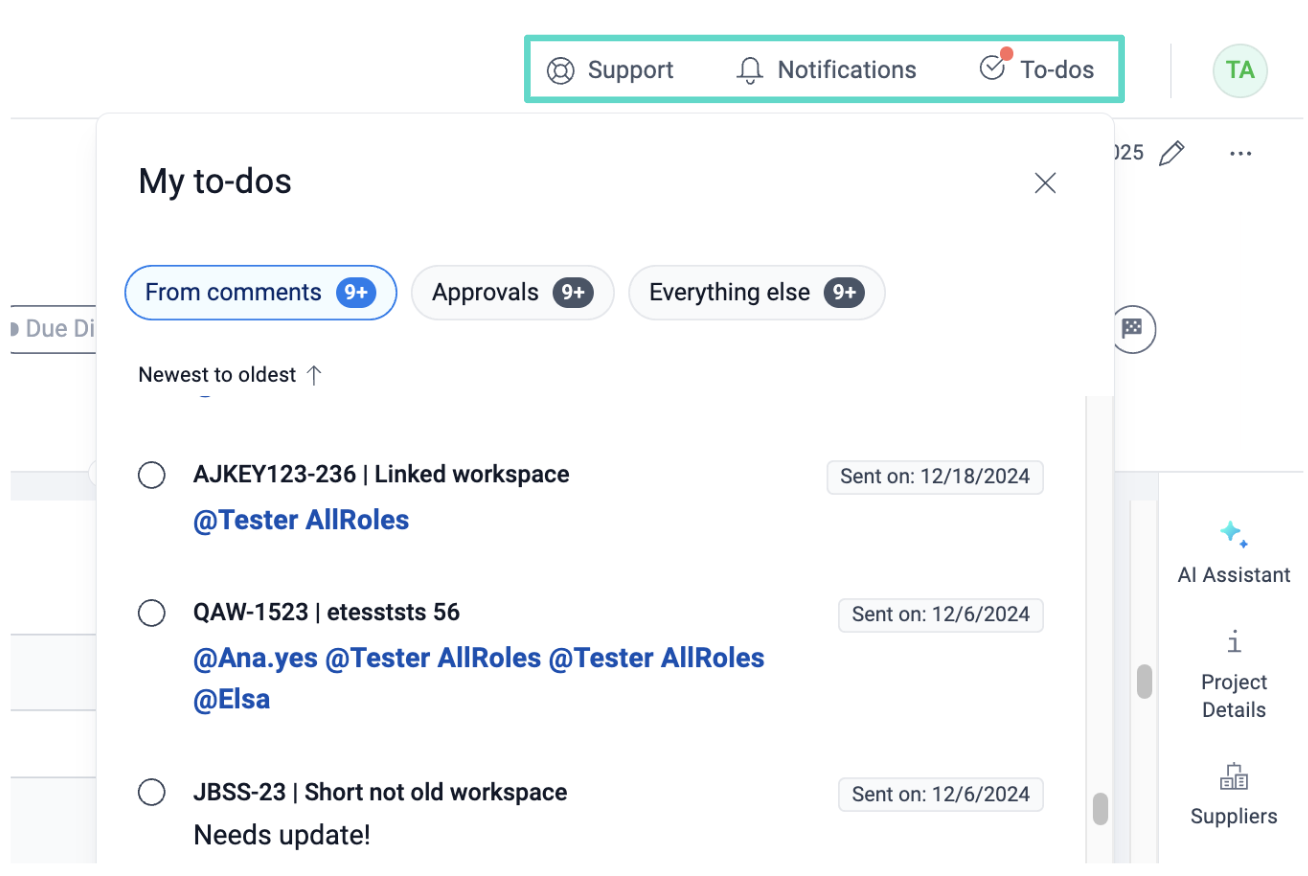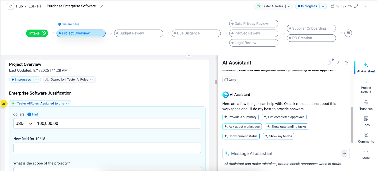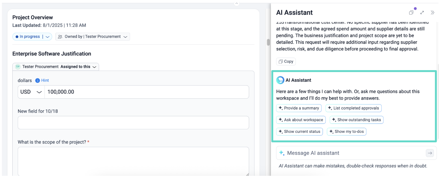 - AI Assistant: Open by default on all Projects, AI Assistant is a generative AI-powered chat tool designed to provide insight into the data entered into the Project.