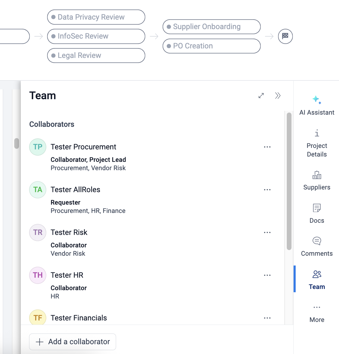 - Team: When selecting Team, users will be shown a full list of all individual users, as well as all user groups within the given Project. Users can also add additional collaborators to the project by selecting “Add Collaborator” at the bottom left of the Team-box.