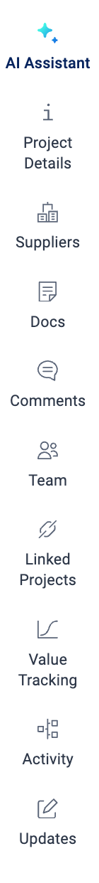 Project Toolbar: The right hand toolbar is a convenient way to see the team, comments, documents, and suppliers; this information is found along the right side of the project. To expand, simply click on the toolbar item: