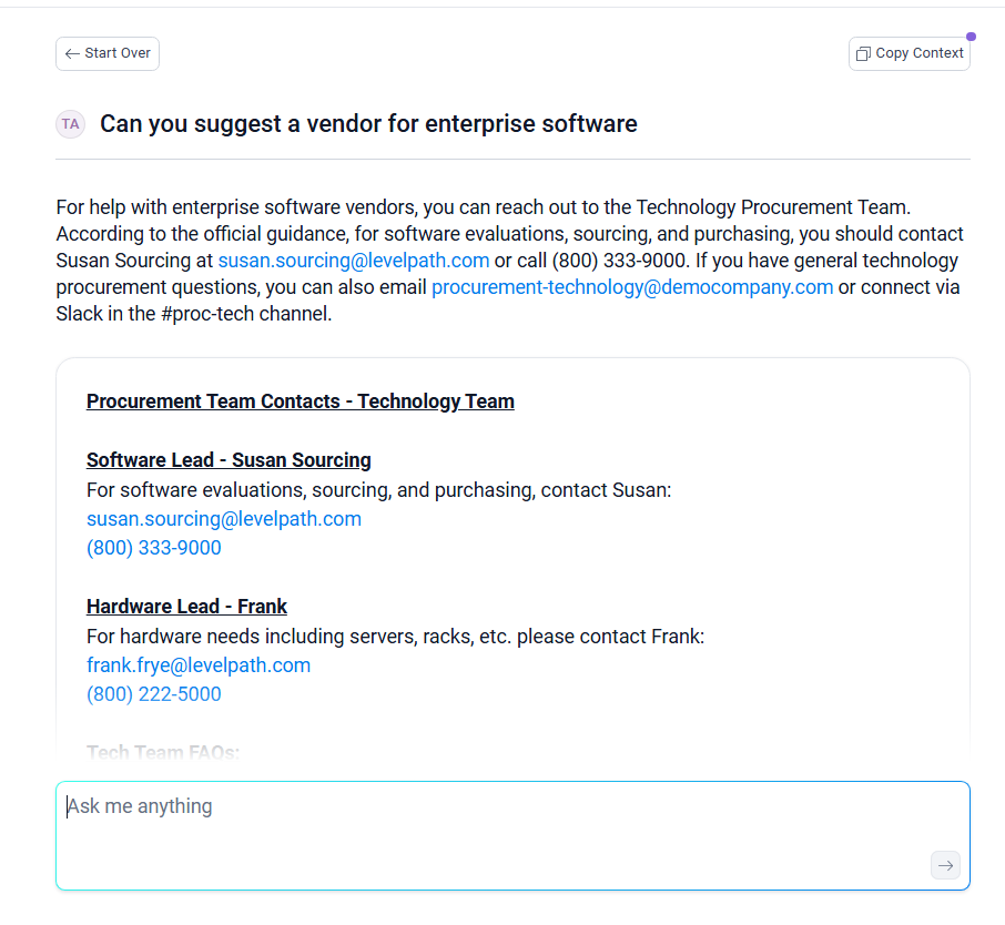 The AI Front Door is an intuitive, conversational interface that leverages your configured Front Door data to guide users to the right project, resource, or answer. Instead of navigating a static menu, users can simply type their questions in natural language and receive intelligent suggestions and direct links to get started. This creates a faster and more user-friendly experience, reducing friction and improving adoption.