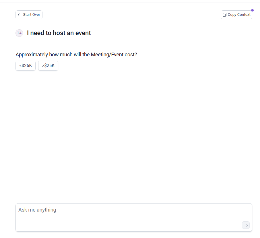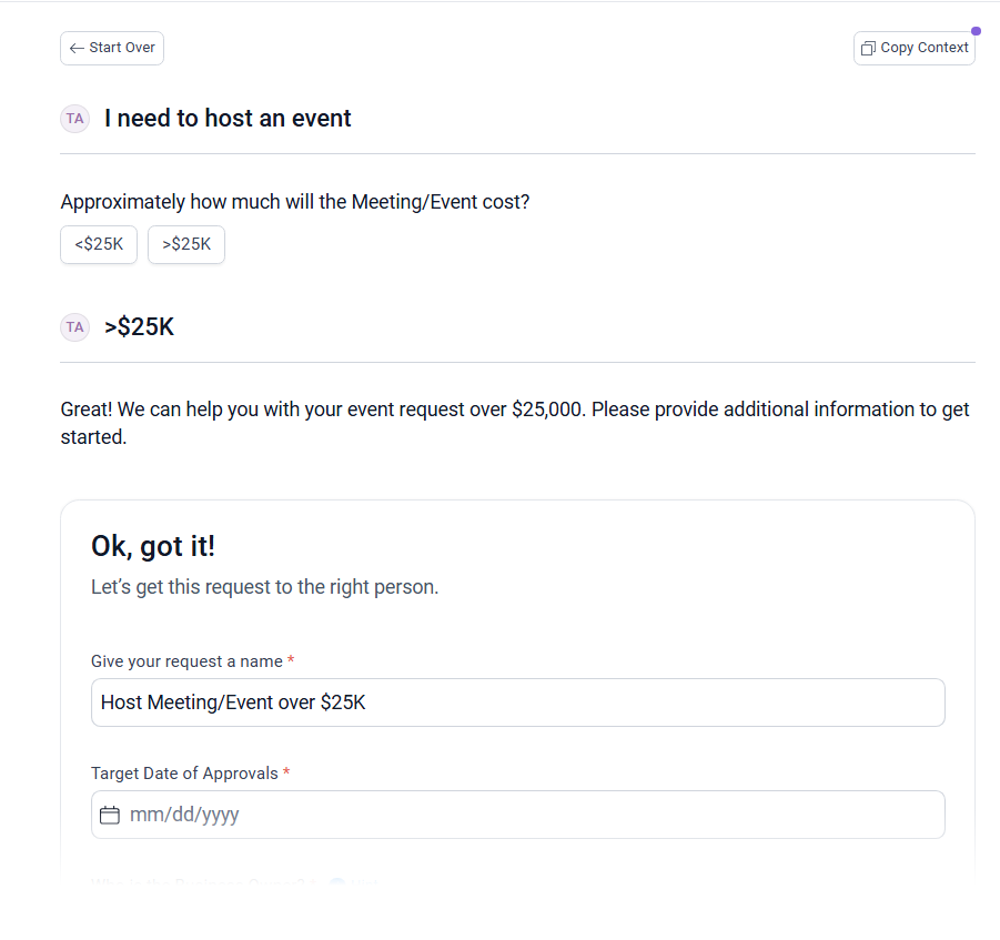 - Presents the correct intake form (e.g., Host Meeting or Event over $25K) as the endpoint with intake for request.
