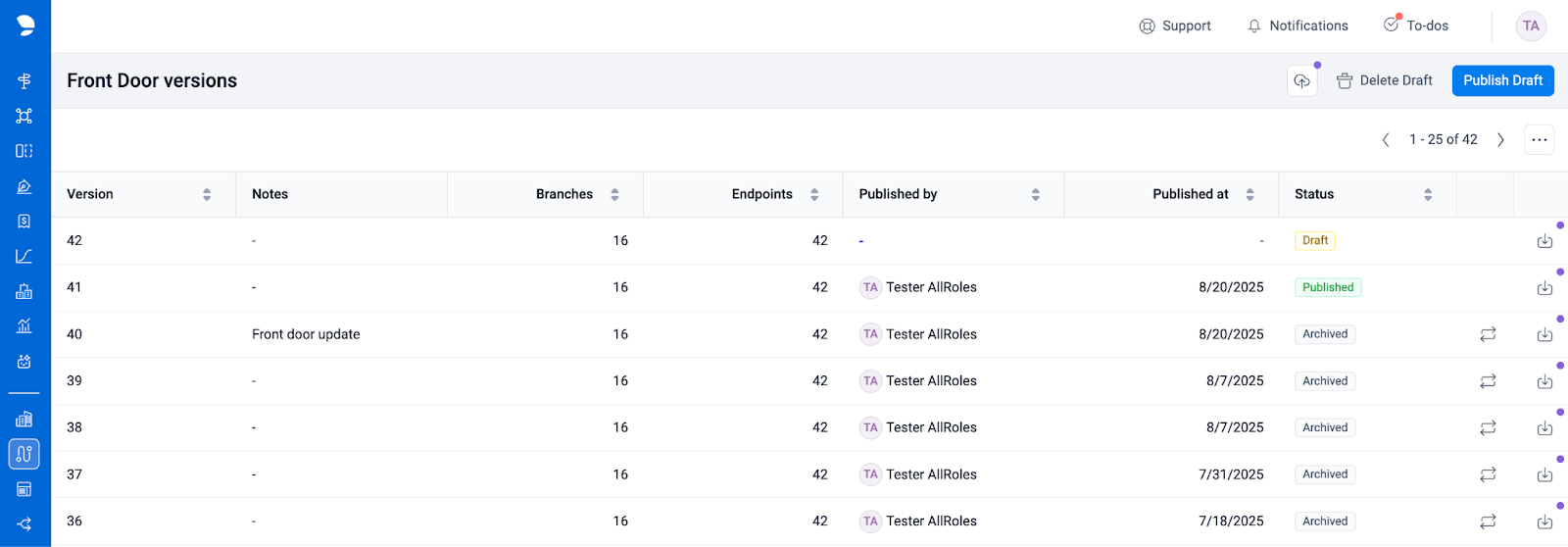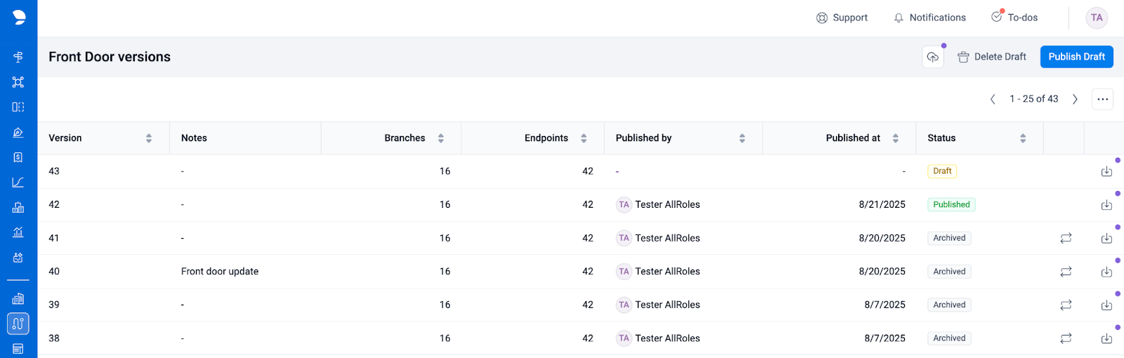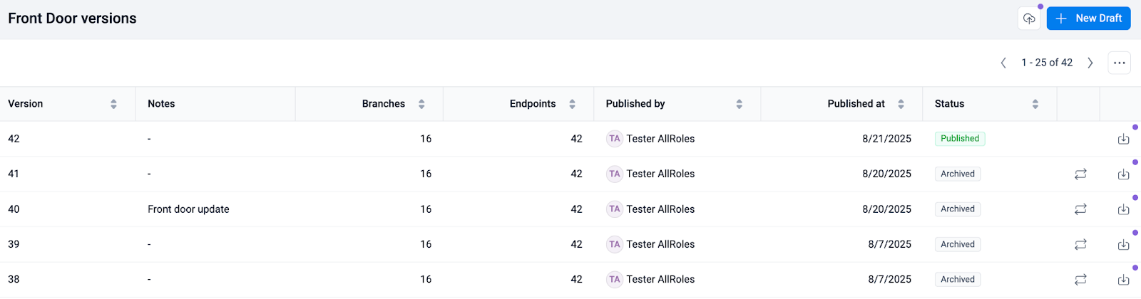 2) The page will automatically show the list of Published, Archived, and Draft Front Door configurations: