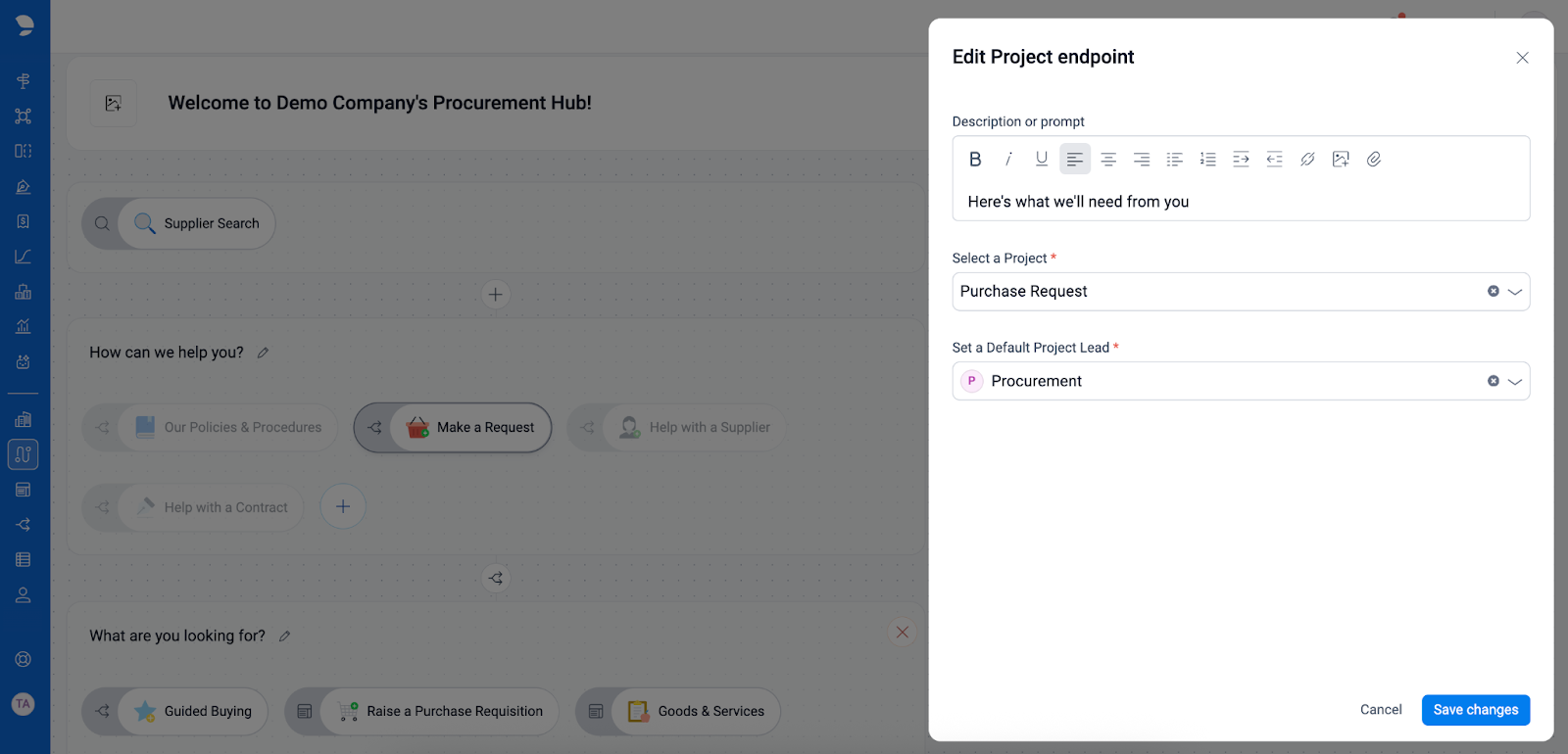 Note: When selecting a project as an endpoint, the Administrator needs to set a default Project Lead. The Project Lead will be able to oversee and facilitate a request as it goes through each step within a project. To configure a particular project, the Administrator will need to head to a different panel within Admin called ‘Project’.