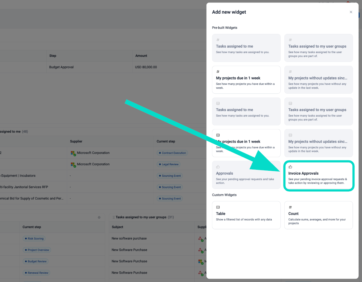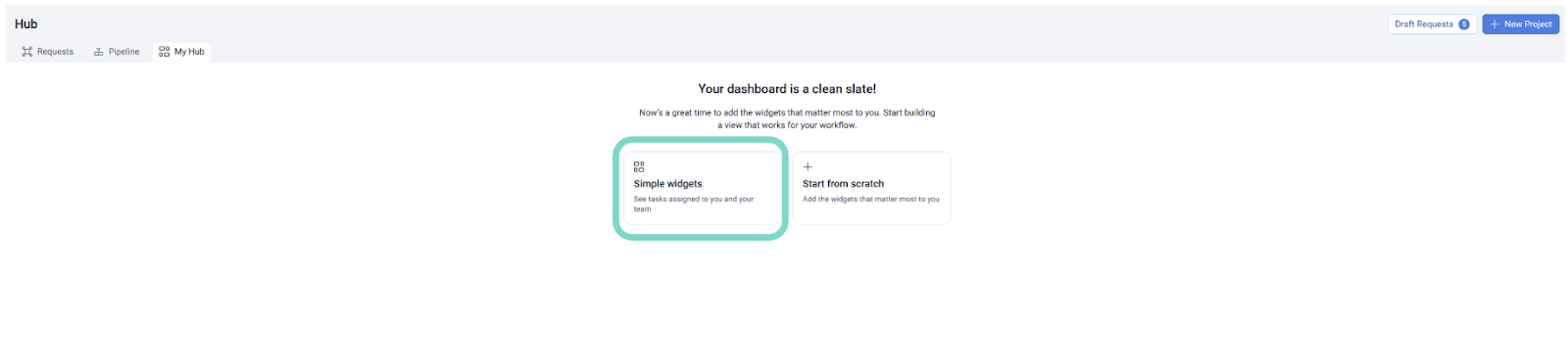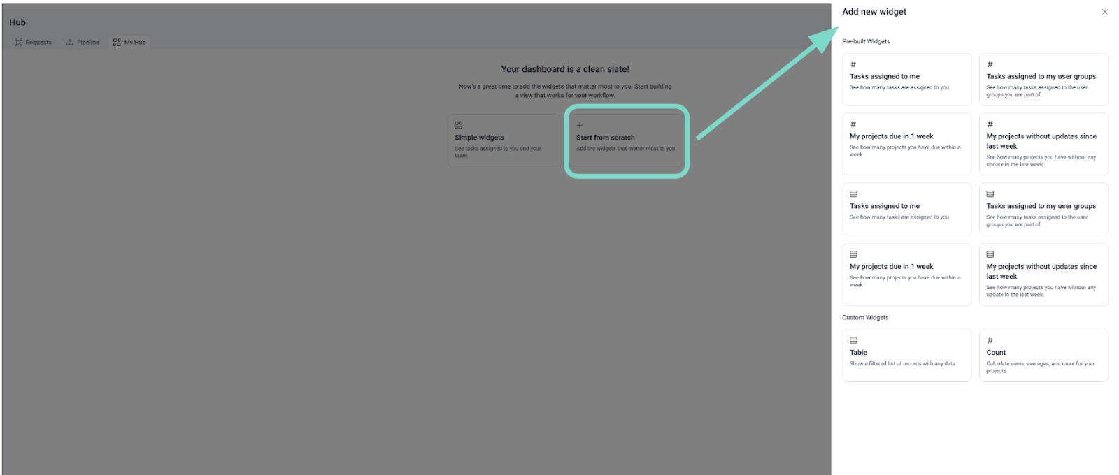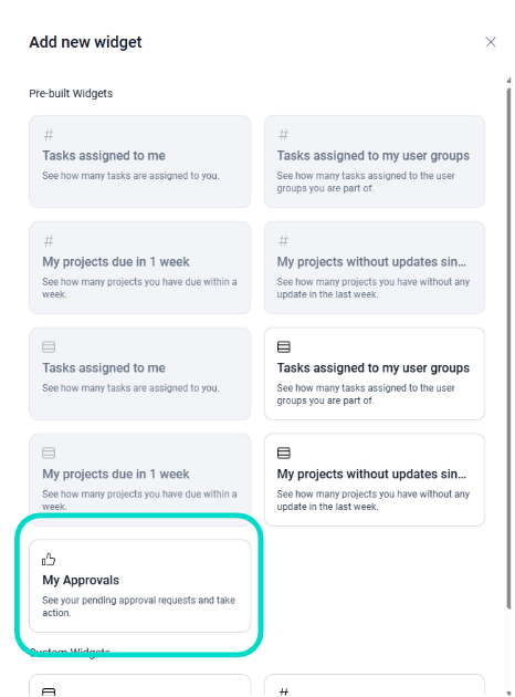 - Select from Pre-built Widgets (like tasks due in 1 week, projects without updates, etc.) or Custom Widgets (tables and counts).