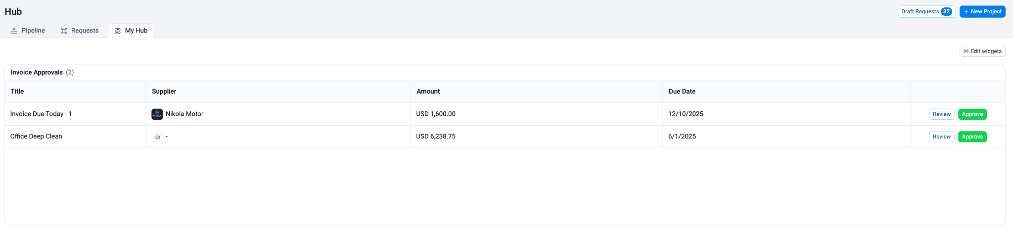 Similarly the Invoice Approvals Widget in My Hub gives users a single place to view and act on all invoice approvals.